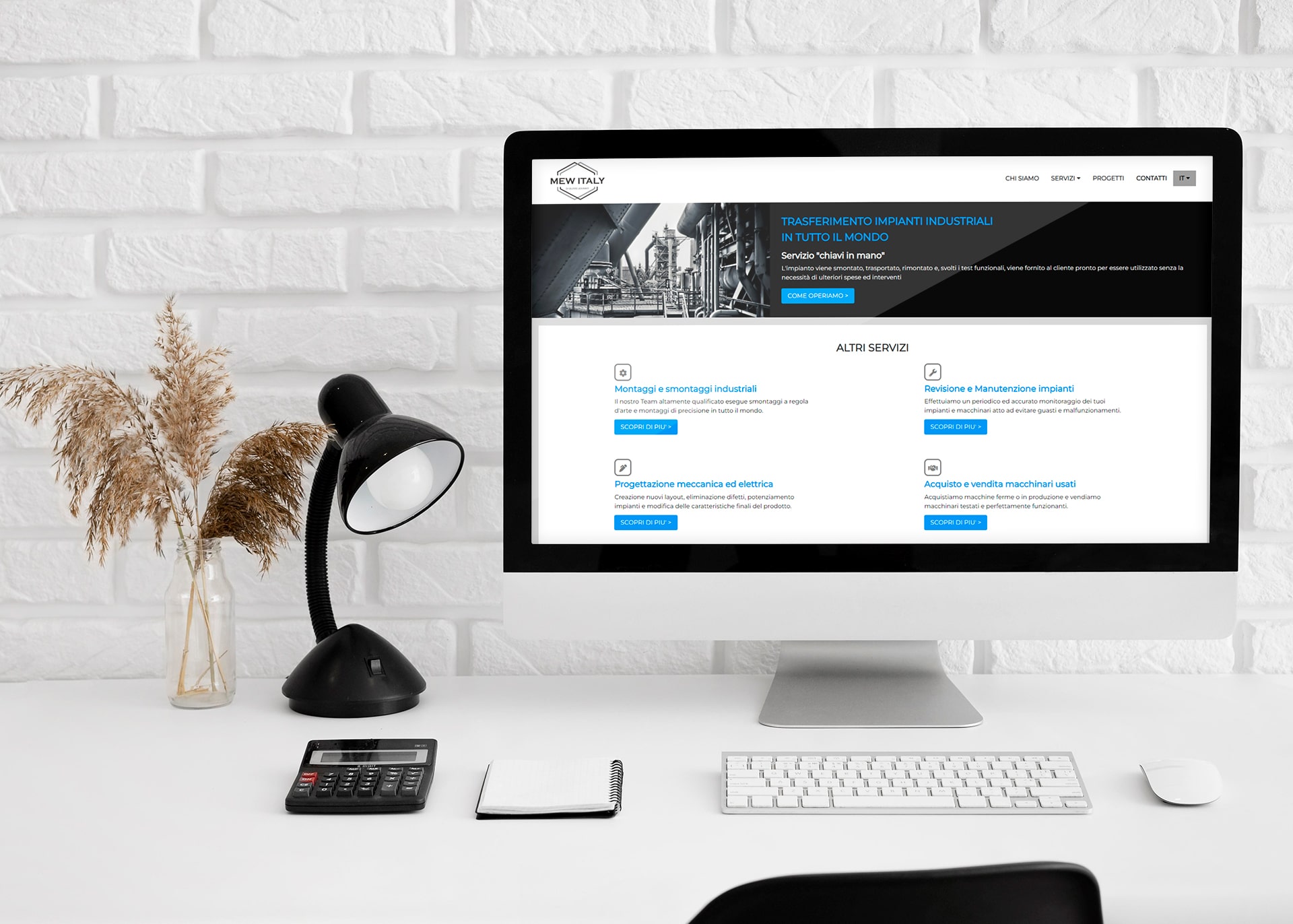 Il progetto che ho realizzato per Mew Italy è sicuramente stato molto complesso e stimolante. Il settore è quello dei servizi industriali, come lo smontaggio, il trasferimento, la manutenzione e la compravendita di macchinari industriali e linee di lavorazione in tutto il mondo.