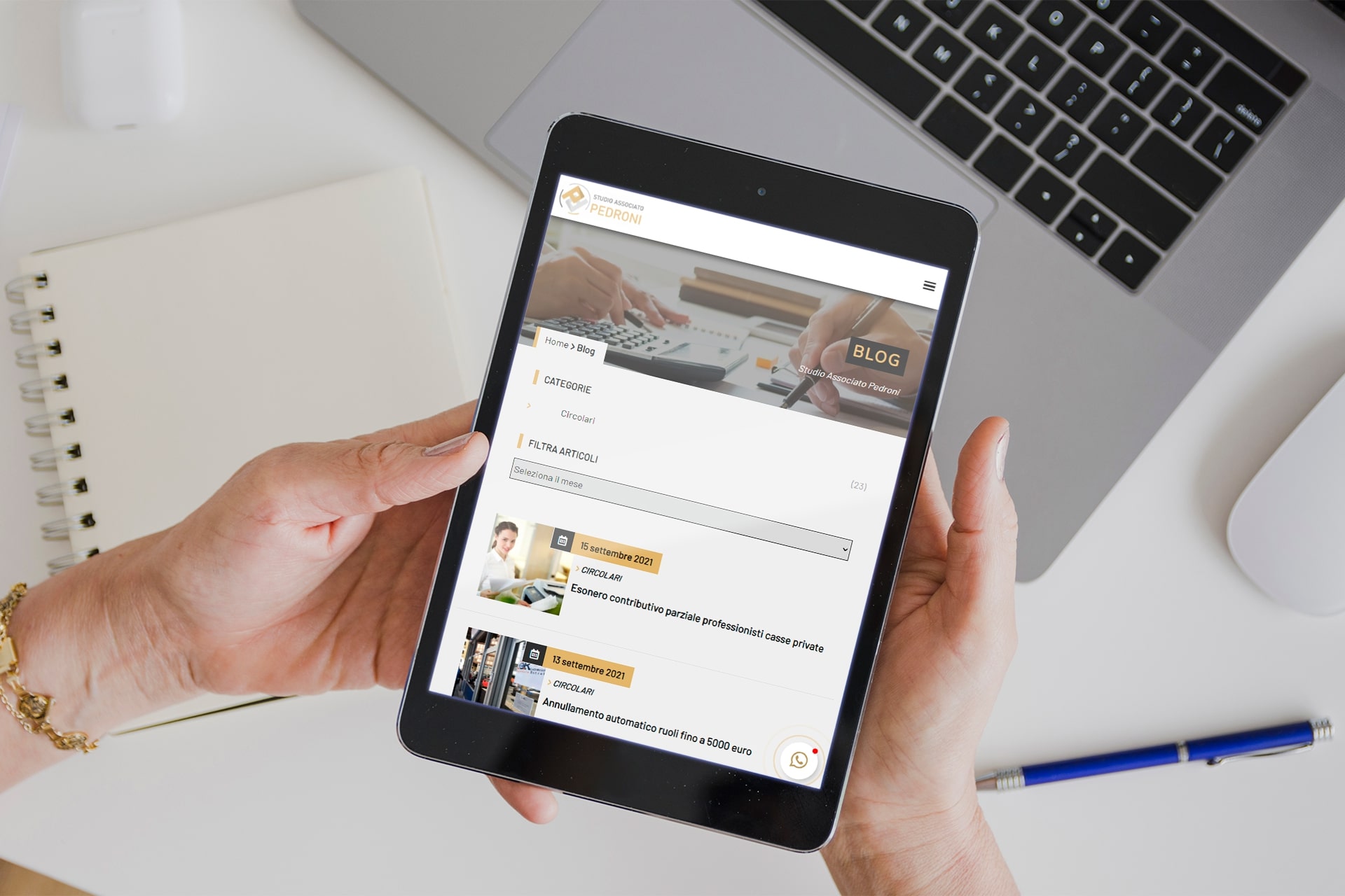 Ho realizzato il logo aziendale, il sito web e la pagina Facebook, dando un'identità moderna ed elegante, utilizzando una palette di colori che è piaciuta subito ed elementi che danno la possibilità allo Studio di mantenere e rafforzare il rapporto con la clientela (es. Blog aziendale, Chat Whatsapp, feed di Economia e Fisco).
